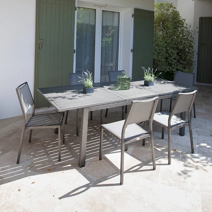 Leur structure en aluminium est trÚs résistante et ne craint pas la corrosion. La peinture epoxy qui recouvre les chaises accroßt encore plus leur résistance et protÚge des UV. La finition brush donne un aspect bois cérusé à la chaise.