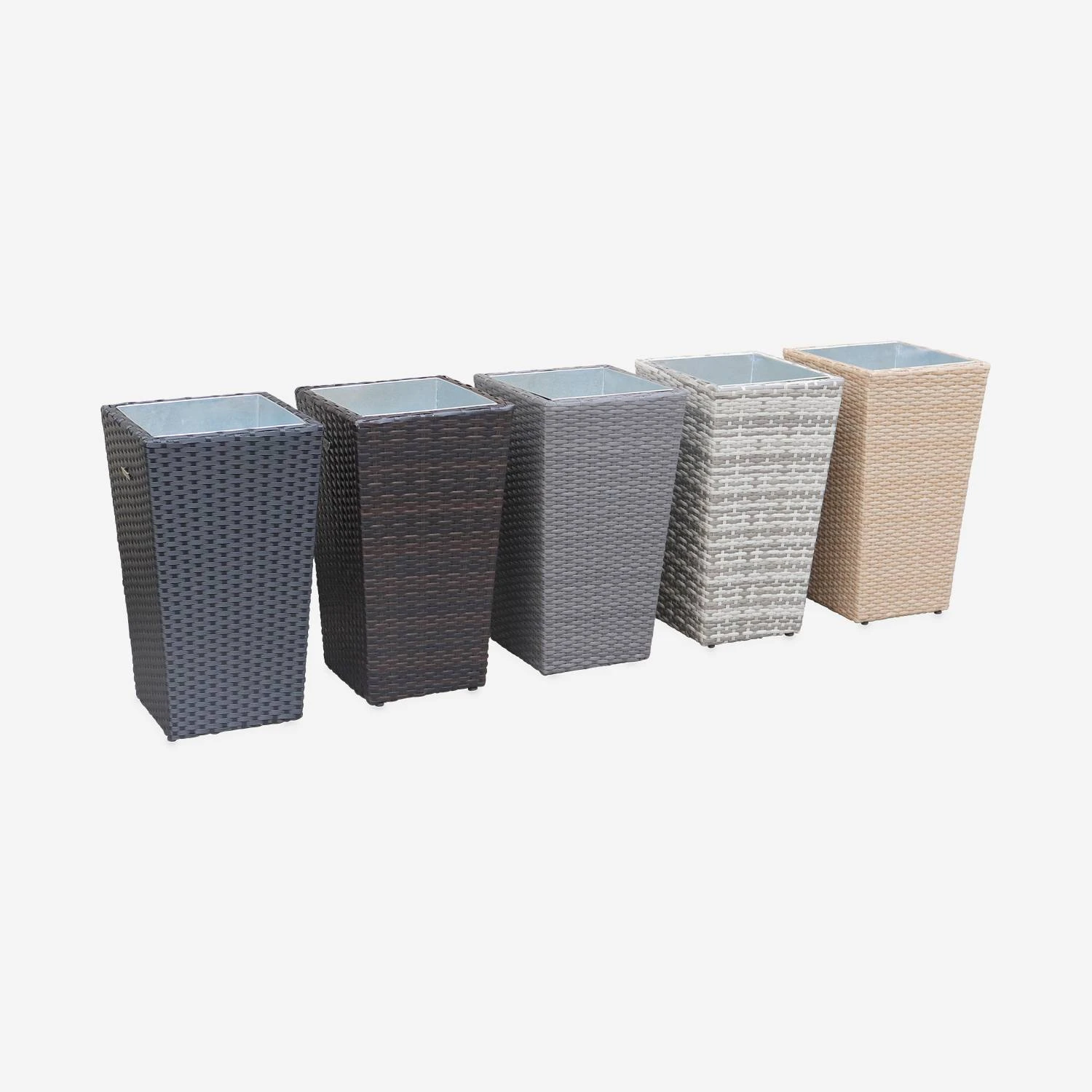 L’ensemble est composé de deux pots de fleurs en aluminium et de deux caches pots de 60 cm en résine tressée. La résine tressée sweeek supporte les rayons du soleil et les intempéries. Elle ressemble au rotin naturel mais n’en présente pas les inconvénients ! La durée de vie des Prato est exceptionnelle. Et pour vous garantir une résistance maximale, les pots de fleurs sont en aluminium renforcé. Chaque production est vérifiée selon un cahier des charges précis.
