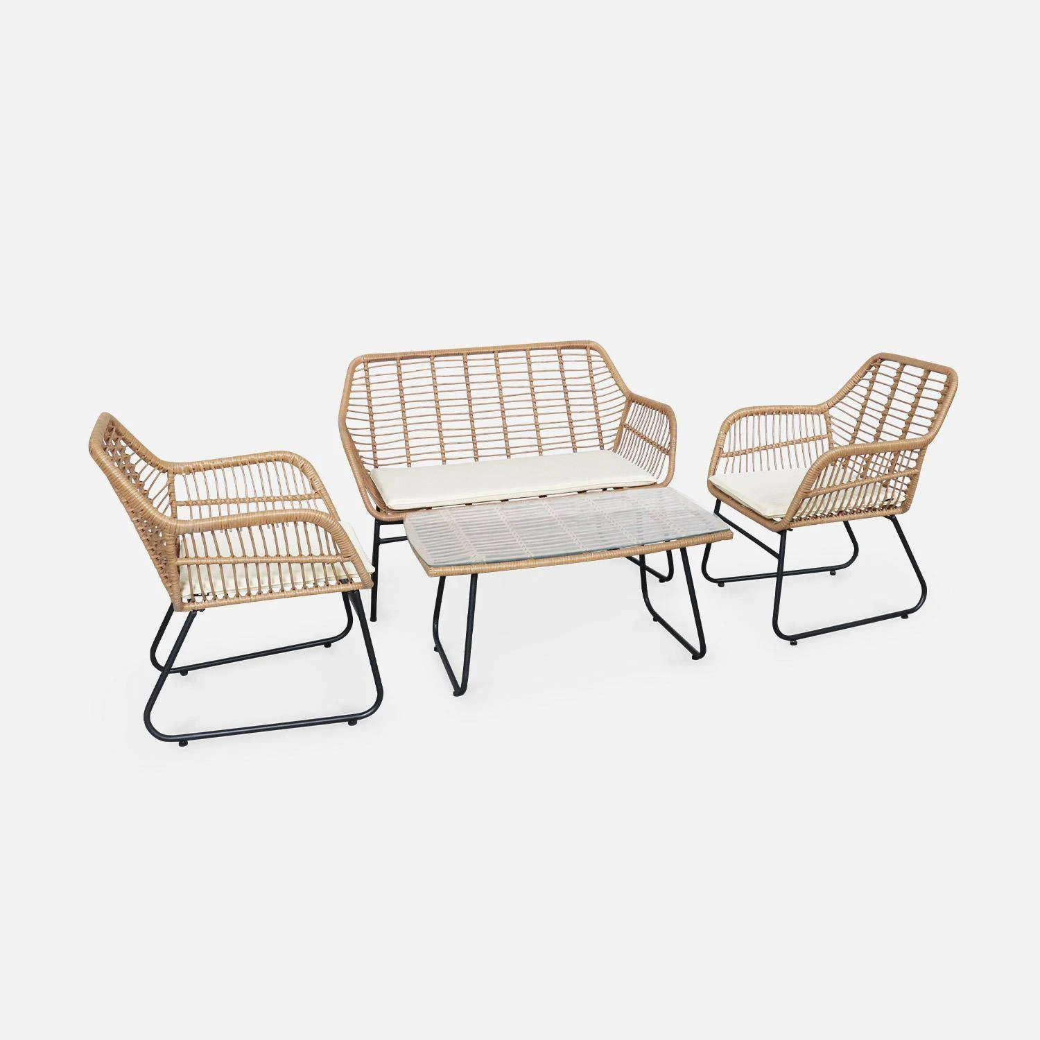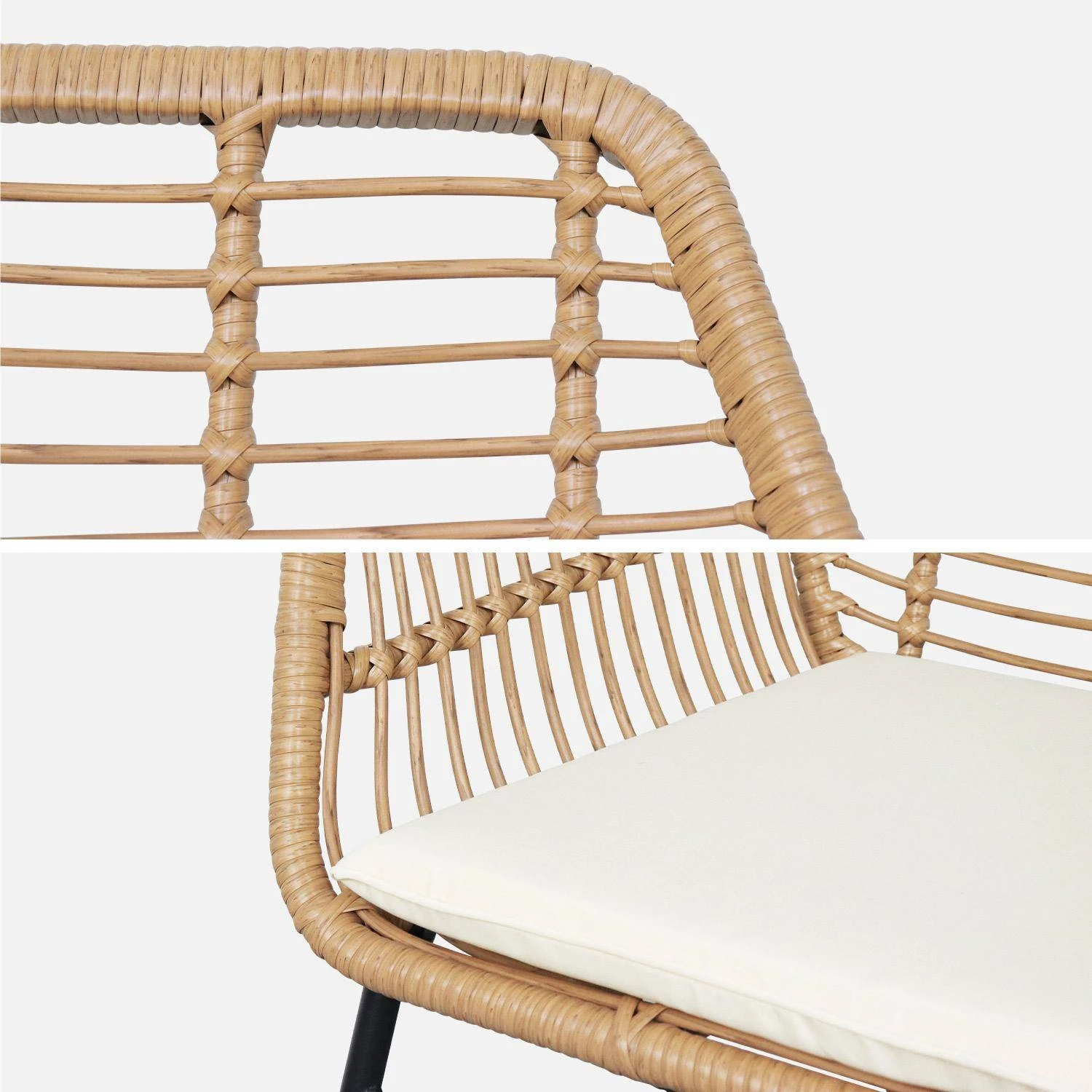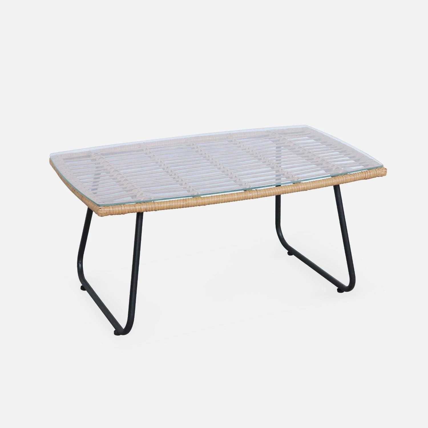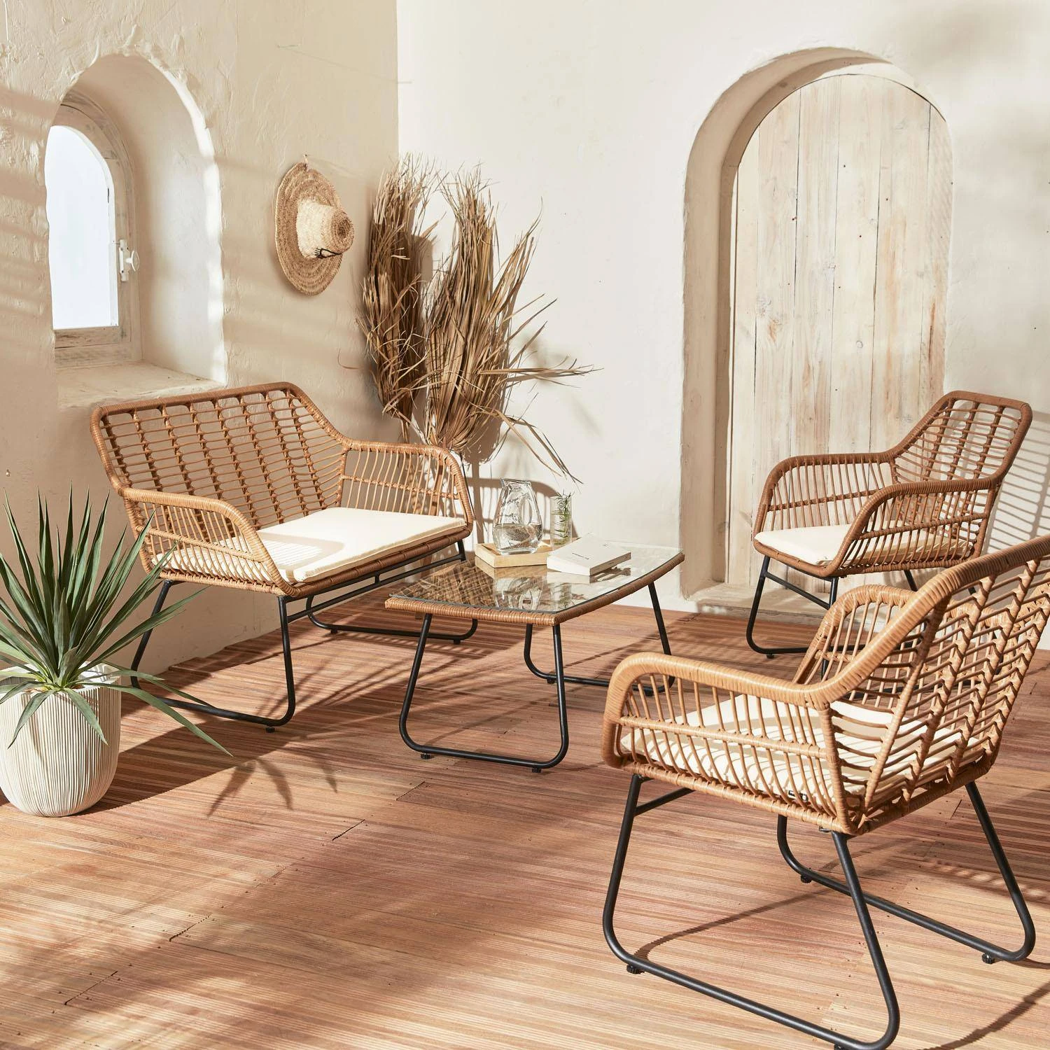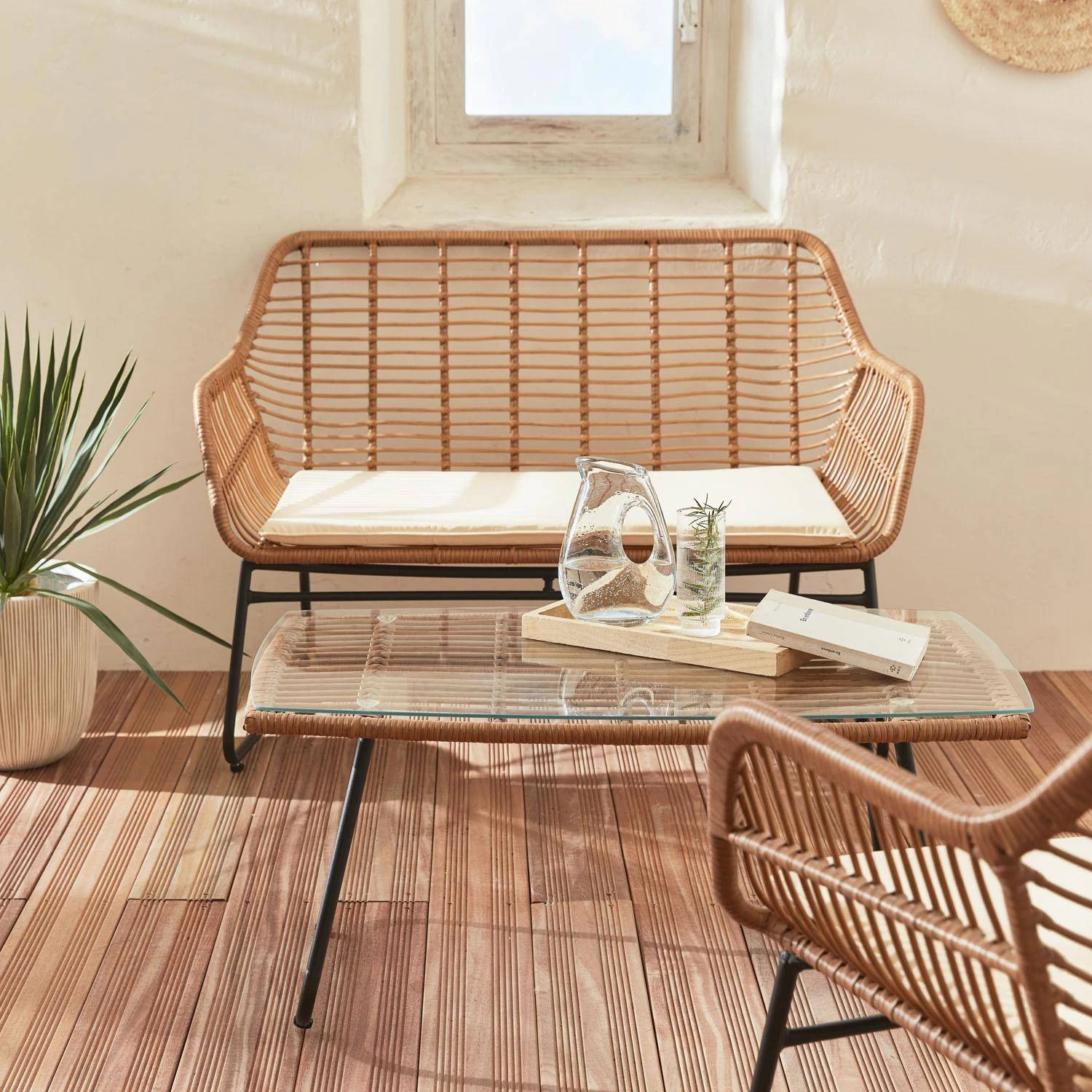 Un salon de jardin au style colonial, en bi-matière. Une résine tressée beige style rotin, pour une touche naturelle dans votre décoration et une structure en métal galvanisé noir apporte quant à elle un mix and match moderne. Le salon de jardin est composé de deux fauteuils, d’un canapé ainsi que d’une table rectangulaire avec un verre trempé de 5 mm, d’une résistance 5 fois plus élevée que le verre traditionnel.