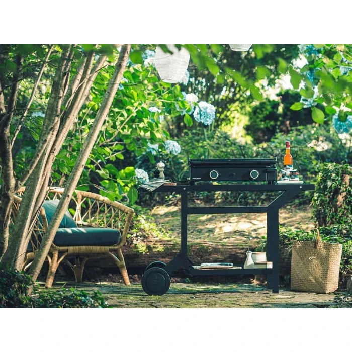 Cette table roulante est conçue pour les planchas Forge Adour 45, 60, et 75. Sa structure en acier est recouverte de 3 couches de peinture couleur noire hautement résistante aux intempéries.