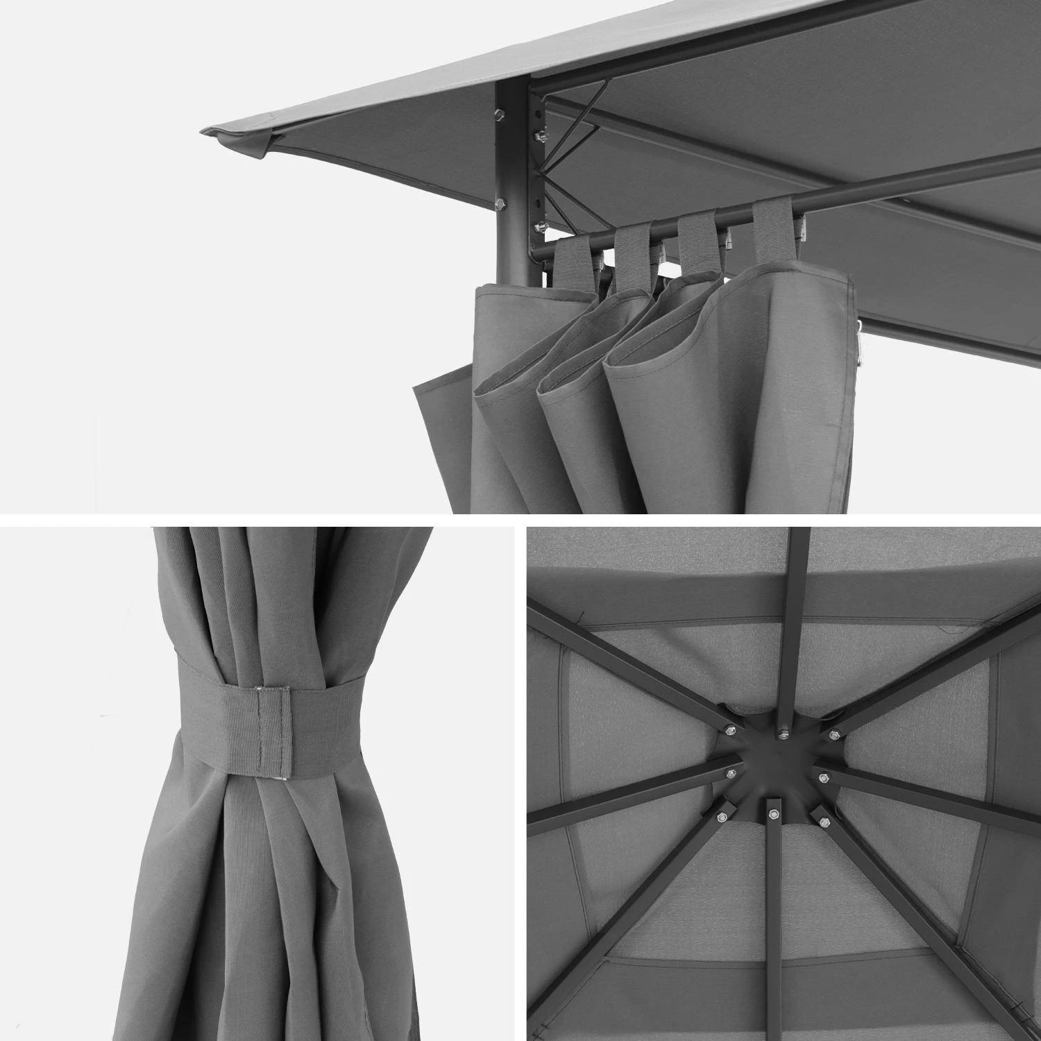 La tonnelle 3 x 4 m Divio est robuste et stable grâce à sa structure tubulaire en acier renforcé. La finition est belle et le coloris uniforme car la structure est recouverte d’une jolie peinture époxy. Sa toile de toit est en polyester et a une densité de 180g/m2. Les rideaux, quant à eux, ont une densité de 140g/m².