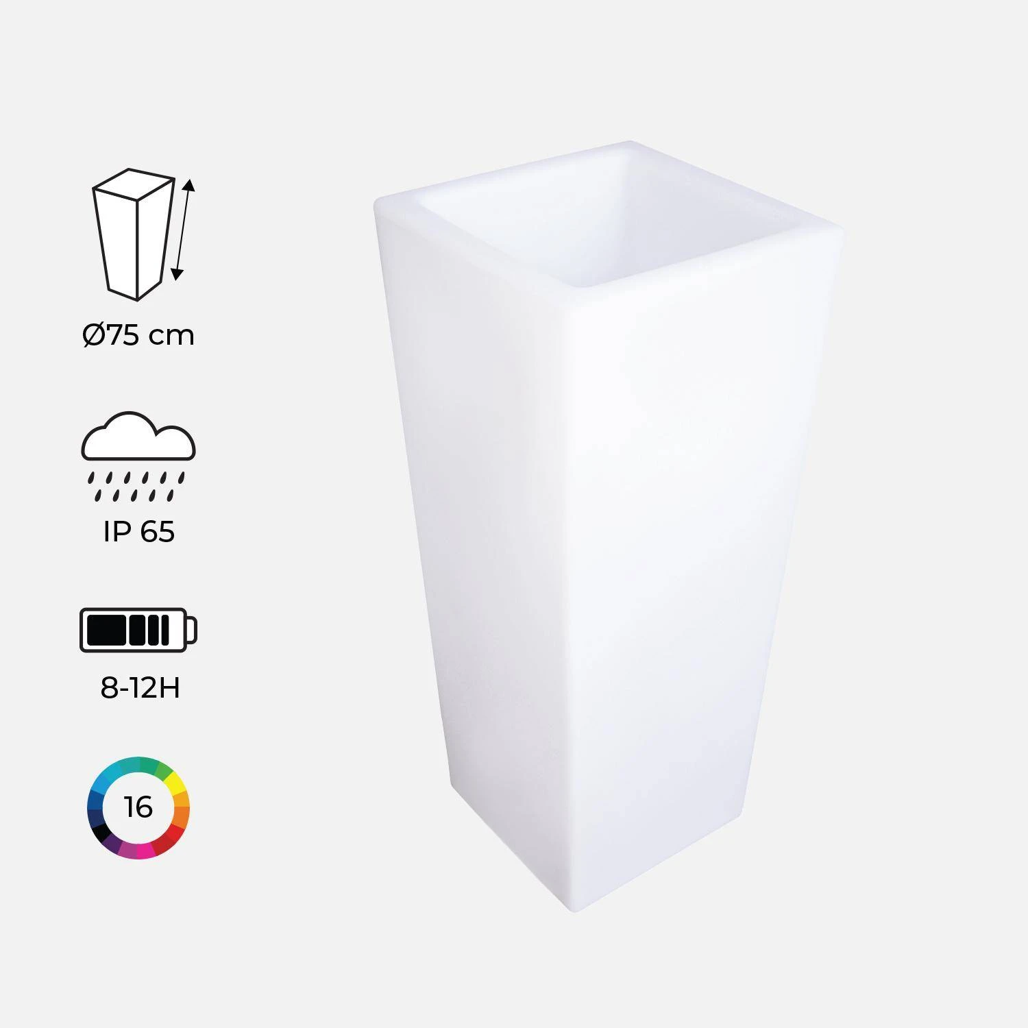 Illuminez votre terrasse, votre jardin ou même votre intérieur grâce au vase lumineux nomade et design. Avec 16 variations de couleurs, vous pouvez créer des ambiances différentes, qui répondent à vos envies du moment. Ce luminaire est blanc lorsque le module LED n’est pas allumé. D’ailleurs, la couleur peut être fixe ou en défilement lent ou rapide. Ces réglages se gèrent avec une télécommande, compatible avec l’ensemble de nos luminaires LED, qui permet également d’ajuster la luminosité du vase. Il est nomade car il fonctionne grâce à une batterie rechargeable.