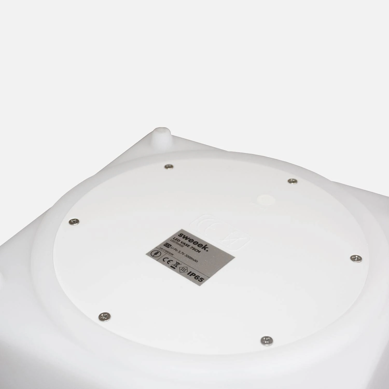 Le vase LED 75cm est en polyéthylène rotomoulé. C’est une matière résistante aux chocs et étanche. Elle est traitée anti UV. Fabriqué selon la norme IP65 qui le rend résistant à l’eau et à la poussière, le vase lumineux supporte averses et éclaboussures, mais n’est pas complètement étanche. Sa batterie est une batterie LiPo 3,7V, 2900mA. Elle se charge 4h à 6h pour 8h à 12h d’utilisation. Le luminaire multicolore se charge par câble USB. Il suffit de brancher le câble USB fourni.